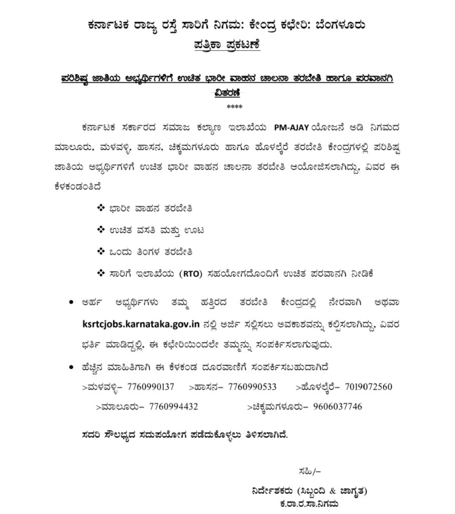 ಪರಿಶಿಷ್ಟ ಜಾತಿಯ ಅಭ್ಯರ್ಥಿಗಳು ಈ ಸರ್ಕಾರಿ ಸೌಲಭ್ಯದ ಸದುಪಯೋಗ ಪಡೆದುಕೊಳ್ಳುವಂತೆ ಕೆಎಸ್.ಆರ್.ಟಿಸಿ ಪ್ರಕಟಣೆ ಮೂಲಕ ತಿಳಿಸಲಾಗಿದೆ.