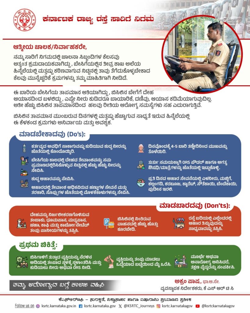 ಬೆಂಗಳೂರು: ರಾಜ್ಯದಲ್ಲಿ ಬೇಸಿಗೆ ತಾಪಮಾನ ತೀವ್ರವಾಗುತ್ತಿರುವ ಹಿನ್ನೆಲೆಯಲ್ಲಿ ಕರ್ನಾಟಕ ರಾಜ್ಯ ರಸ್ತೆ ಸಾರಿಗೆ ನಿಗಮ (ಕೆಎಸ್‌ಆರ್‌ಟಿಸಿ) ತನ್ನ ಚಾಲಕರು ಮತ್ತು ನಿರ್ವಾಹಕರಿಗೆ ವಿಶೇಷ ಮುನ್ನೆಚ್ಚರಿಕಾ ಸೂಚನೆಗಳನ್ನು ನೀಡಿದೆ.